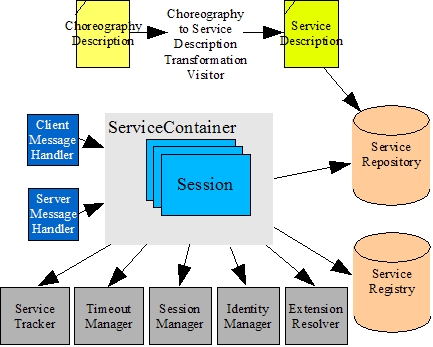 The session component represents the state information associated with a particular instance of a service description. This state information includes the information associated with the service description logic (i.e. variables), as well as information related to the current position within the service description.