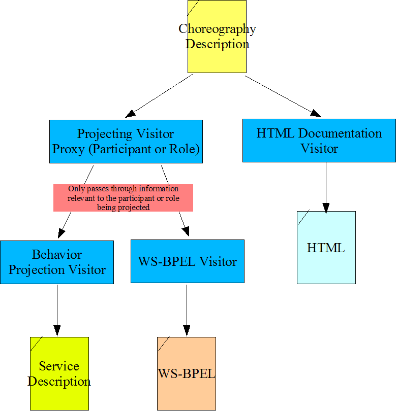 The projection mechanism uses the visitor pattern to traverse the Choreography Description.